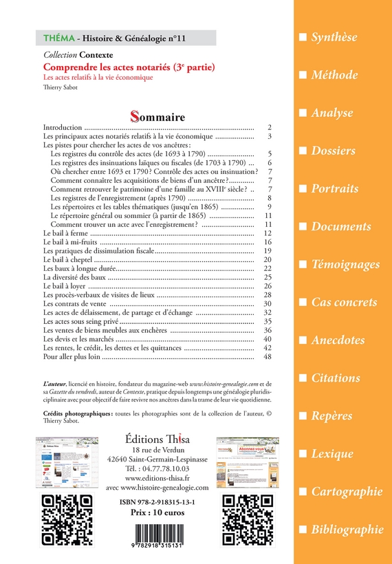 Réf.: 11Après deux Théma consacrés aux actes notariés relatifs à la personne ou à la famille (cf. les Théma 7 & 8), un troisième fascicule s’imposait pour présenter l’ensemble des actes notariés relatifs à la vie économique de nos ancêtres.