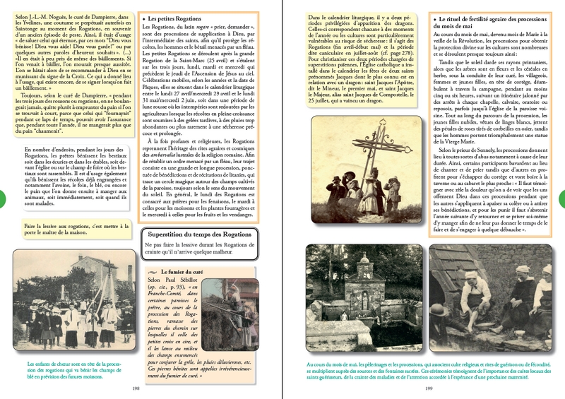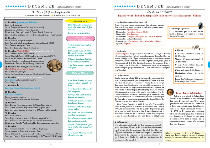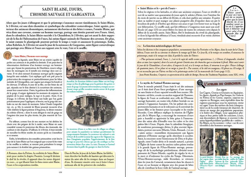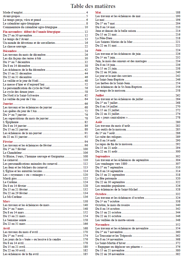 En suivant une approche calendaire, au rythme des travaux agricoles saisonniers et des cérémonies profanes et religieuses, voilà le cadre du voyage dans le temps que je vous propose au fil des pages de cet almanach. Vous ne serez pas étonné d’y rencontrer François Rabelais, le poète Claude Gauchet, les abbés Thiers, Pochard, Jean Lebœuf, Aulanier, mais aussi Jacques de Voragine, Hildegarde de Bingen, le missionnaire Michel le Nobletz, le curé d’Ars, Gargantua, la fée Mélusine, le Dahou, la Grand’ Gueule, la Maisnieye-Hennequin, la Tarasque, le fantôme de la Brie, Olivier de Serres, le sieur de Gouberville, Madame Gacon-Dufour, Anatole Le Braz, Frédéric Mistral, Eugène Le Roy, Émile Guillaumin, Henri Vincenot, Émile Zola et toute une foule de saints protecteurs et « merveilleux »...