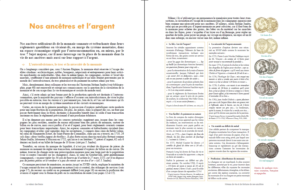 Au cours des recherches pour préparer ma réponse, je me suis pris d’intérêt pour le sujet et j’ai découvert alors l’extraordinaire complexité des relations qu’entretenaient, sur la longue durée, nos ancêtres avec l’argent-monnaie. J’ai appris aussi que les travaux récents des historiens avaient quelque peu corrigé nos connaissances sur le sujet : en effet, il est désormais admis que, sous l’Ancien Régime, la monnaie servait bien, plus qu’on ne le pensait, jusque dans les campagnes les plus profondes, aux règlements de la vie quotidienne comme aux transactions importantes.