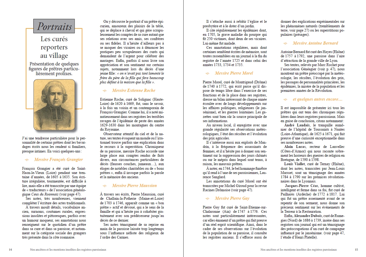 Mais dans beaucoup de paroisses, ces livres sont aussi le confident du prêtre qui, en véritable « journaliste » local, note dans les actes, dans les marges ou sur les feuillets restés blancs des mentions insolites, événementielles, sur le temps, les récoltes, les fléaux, la fluctuation des prix, les faits divers, les naissances ou les sépultures extraordinaires et bien d’autres sujets encore…